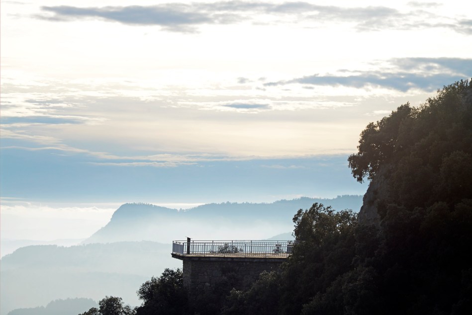 Adyacente a la iglesia se encuentra un edificio que antes era una hospedería y que hoy aloja el restaurante y el funicular que sube hasta este punto desde el párking, al que se puede acceder de forma muy cómoda en coche. En nuestro caso, por aquello de andar un poco y hacer algo de montaña, dejamos el vehículo a una media hora a pie. Subimos a medio camino entre senderos más o menos escondidos y la propia carretera hasta llegar a la zona del aparcamiento, con unas vistas espectaculares sobre esta parte del Berguedá. Y con la posibilidad -casi capricho- de coger el funicular para subir hasta lo alto en el Santuario. De hecho el funicular apenas supera un desnivel de una decena de metros que se puede salvar sin demasiados esfuerzos también por las escaleras. Nosotros lo cogimos por la gracia de hacerlo. Nos sorprendió que la cantidad se abona en lo alto cuando el mismo chico que atiende el restaurante es también el encargado de cobrar el funicular. Lo hicimos encantados, sobre todo al descubrir aquel espacio. Un rincón ideal desde donde disfrutar de las panorámicas y hacerlo, además, calentitos. Elemento, este último, de agradecer, especialmente en invierno.