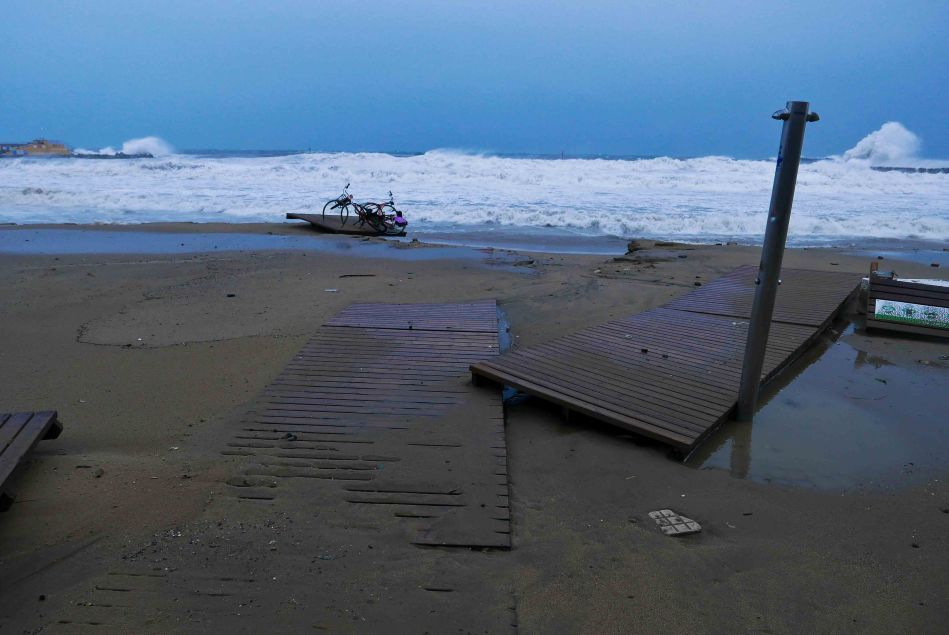 En la zona de la Vila Olímpica, olas espectaculares, poderosas, fieras, sobrepasaban los límites de los rompeolas alcanzo alturas entre los cuatro y seis metros, e incluso por encima. Durante el paseo, pasarelas de madera rotas. Unas bicicletas de una empresa de alquiler, sobrevivían al embite del viento a duras penas cediendo y perdiendo consistencia. Olas que se comían la arena hasta llegar a los restaurantes.