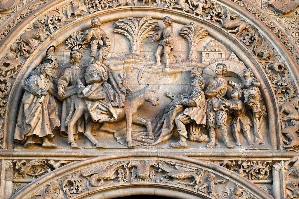 Acabada la visita nos fuimos hacia la Catedral Nueva que, por dentro, conecta también con la Antigua, algo no demasiado habitual. Una fue construída, como es lógico, para sustituir a la segunda pero al final optaron por mantenerlas a ambas en pie. Y bien, pensamos, que hicieron. La más reciente data de entre los siglos XVI y XVIII y es de estilo gótico tardío, alta y espectacular; mientras la originaria, más pequeña, es de los siglos XII a XIV y contiene partes románicas. En la Nueva, llama la atención la Puerta de Ramos, ricamente decorada y que, según leemos, cuenta incluso con la figura de un astronauta o de un dragón con un helado entre su gran multiplicidad de elementos. Guiños de los artistas.