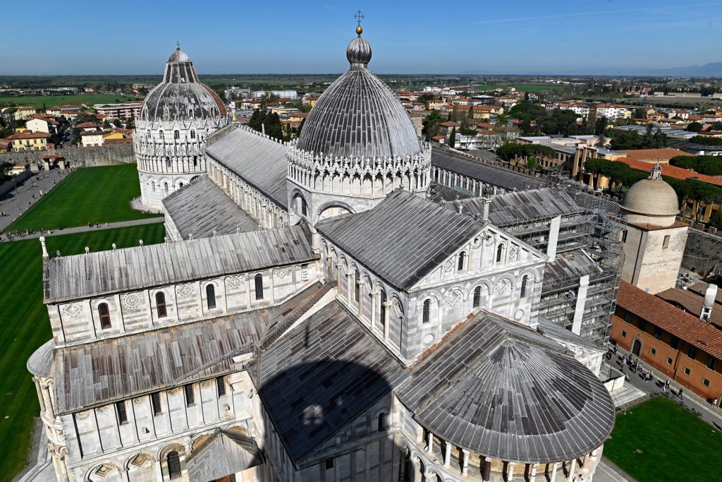 La torre es del siglo XII y ya empezó a inclinarse desde sus inicios, por encontrarse en suelo arcilloso y no contar con los cimientos necesarios (corregidos más tarde). Enfrente se encuentra la Catedral (duomo), que es gratuita pero que requiere de entrada que se puede conseguir en un edificio muy próximo y que se realiza a horas marcadas. Llama la atención su monumentalidad, techos, mosaicos, el púlpito y sus grandes hileras de columnas de estilo corintio. No muy conocida -o no tanto como la propia torre- es uno de los grandes monumentos de la ciudad y de la región. Data de 1063 y, como el resto de construcciones en esta zona de Pisa, es de mármol blanco y gris.