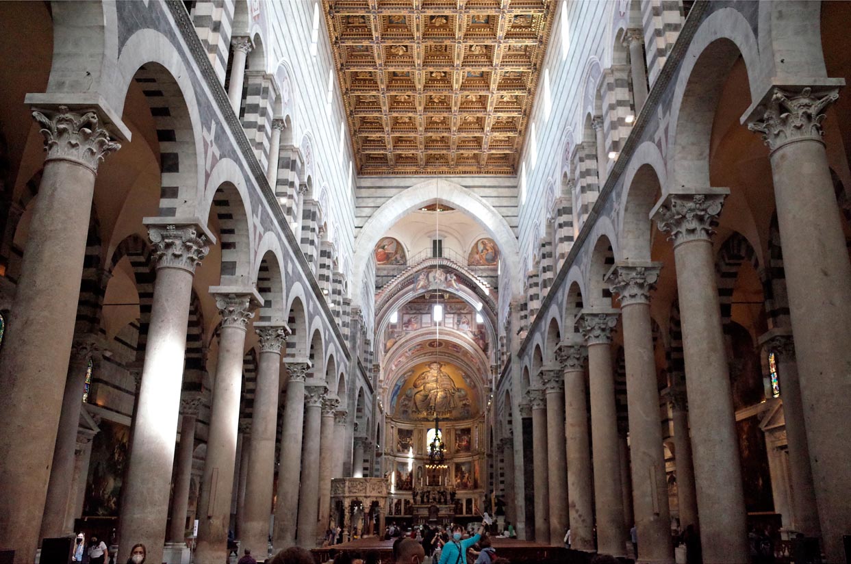 La torre es del siglo XII y ya empezó a inclinarse desde sus inicios, por encontrarse en suelo arcilloso y no contar con los cimientos necesarios (corregidos más tarde). Enfrente se encuentra la Catedral (duomo), que es gratuita pero que requiere de entrada que se puede conseguir en un edificio muy próximo y que se realiza a horas marcadas. Llama la atención su monumentalidad, techos, mosaicos, el púlpito y sus grandes hileras de columnas de estilo corintio. No muy conocida -o no tanto como la propia torre- es uno de los grandes monumentos de la ciudad y de la región. Data de 1063 y, como el resto de construcciones en esta zona de Pisa, es de mármol blanco y gris.