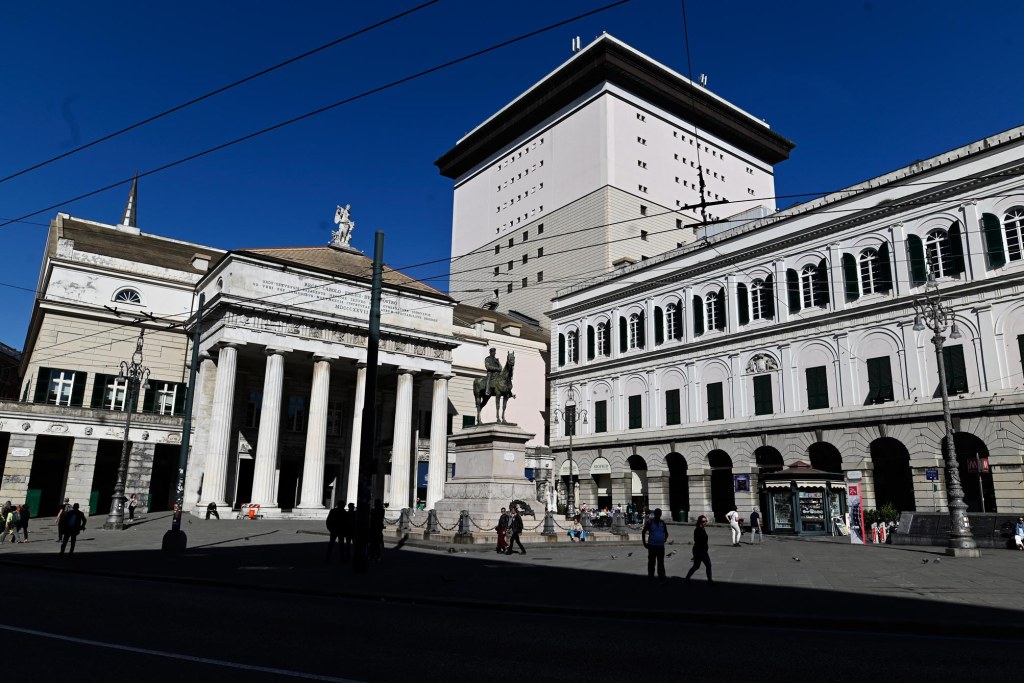 No muy lejos se encuentran otros dos puntos neurálgicos y centrales de la ciudad como son la Piazza de Ferrari, dedicada al duque Raffaelle Ferrari que dono una gran suma de dinero en 1875 para ampliar el puerto de Génova y que cuenta con una característica, geométrica y con cierta gracia fuente central de bronce. Y, prácticamente al lado -puede verse de forma directa una desde la otra-, el Teatro Carlo Felice: ópera de la ciudad, inicialmente erigida en 1823 y fuertemente dañada durante la Segunda Guerra Mundial, obligada por lo tanto de serias actuaciones de reparación. Con capacidad en su sala principal para 2.000 personas, recuperó la idea de plaza cubierta de 600 metros cuadrados de superfície y conserva las columans de la inicial. Se puede cruzar y acceder a unas galerias también a resguardo -que durante nuestra visita estaban cerradas- y que llevan sin demasiadas dificultades hasta la via Garibaldi.
