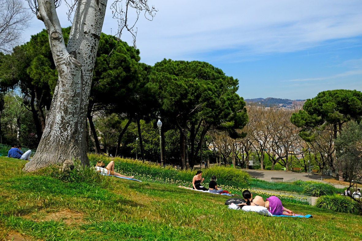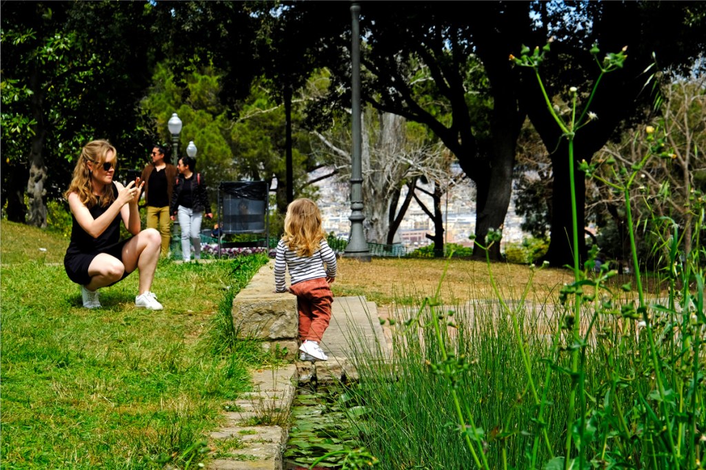 una de las laderas de la ‘montaña mágica’ de Montjuïc, ocupan alrededor de 2.800 hectáreas y destacan sobre todo por su gran diversidad de flores y vegetación. Además, según leemos, en un día soleado puede incluso llegarse a divisar, desde alguno de sus puntos, a lo lejos el Montseny. Que no es poco. Lo que nosotros sí llegamos a ver desde allí mismo, fue una muy bonita panorámica de la ciudad, con la Sagrada Família moderadamente cerca y, al fondo, las cimas de la sierra de Collserola.
