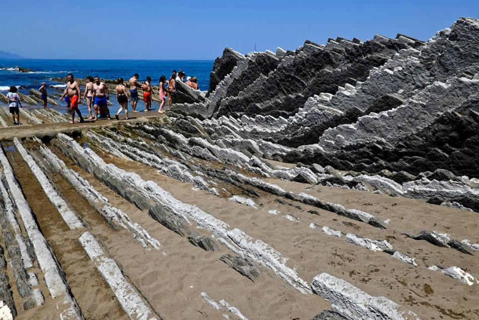 Todo esta parte, por lo tanto, es recomendabe y vale la pena disfrutarla con calma, ya sea a la ida o a la vuelta, pero lo verdaderamente espectacular y llamativo está en la costa, en la playa, en sus abruptos acantilados, que quitan el aliento. Sin exagerar. El término técnico con el que se refieren a las formaciones geológicas más famosas localizadas en estas playas es el de «flytsch» y que se refiere a rasas mareales. El número de curiosos que vistábamos Zumaia y que nos concentramos en esa parte de la playa de Itzurun era sintómatico y clarificador de la gran atracción que generaba (dejamos en este artículo alguna foto, pero en nuestro perfil en Instagram -@evrevista- publicaremos más). El contraste entre gente en traje de baño y disfrutando de su tiempo libre y de días de descanso, chocaba, con la fuerza, potencia, de estos accidentes geográficos esculpidos a lo largo del tiempo por la fuerza de las olas.