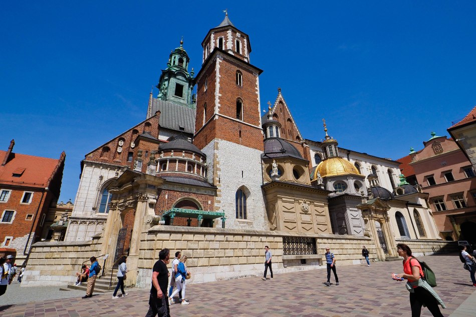 Hecha esa primera introducción, tocaba desandar el camino para, esta vez, reseguir nuestros pasos de forma más detenida. Circunstancia que tampoco fue pesada, ya que toda la zona antigua, donde se concentran los principales edificios y lugares más populares, se cubren en una media hora a pie. Nos fuimos, desde la Puerta y cruzando nuevamente la plaza, hasta la colina, en el otro extremo para, una vez arriba -con unas muy buenas vistas sobre el río Vístula-, tratar de visitar el Castillo y la Catedral -esta última, de estilo ecléctico, suma de barroco, renacentista y algunos más, y de dimensiones exteriores contenidas aunque sí muy potente por dentro-. De la Catedral, destacan varias capillas, la enorme campana Segismunda -visitable, previa subida de unas cuantas decenas de escalones pero que impresiona- y las criptas reales.