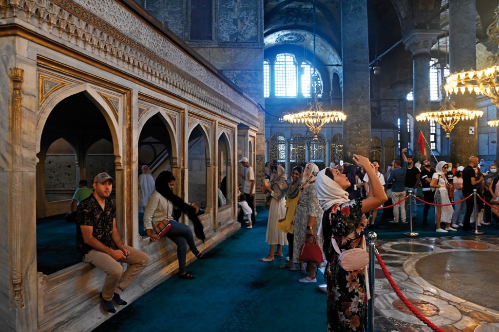 Actuó como tal (mezquita) desde 1453 hasta 1931, cuando el reformista Kemal Atatürk la cerró para abrirla como museo, pocos años después, en 1935. En fecha reciente, 2020, volvió a decidirse, tras orden del actual presidente Erdogan, que funcionara como mezquita. De su arquitectura, llama la atención su espectacular cúpula central, de más de treinta metros de diámetro y a una altura de 56 metros, así como sus mosaicos bizantinos, precisamente tapados desde hace cerca de tres años por ajustarse a la prohibición de exhibir imágenes en este tipo de espacios religiosos.