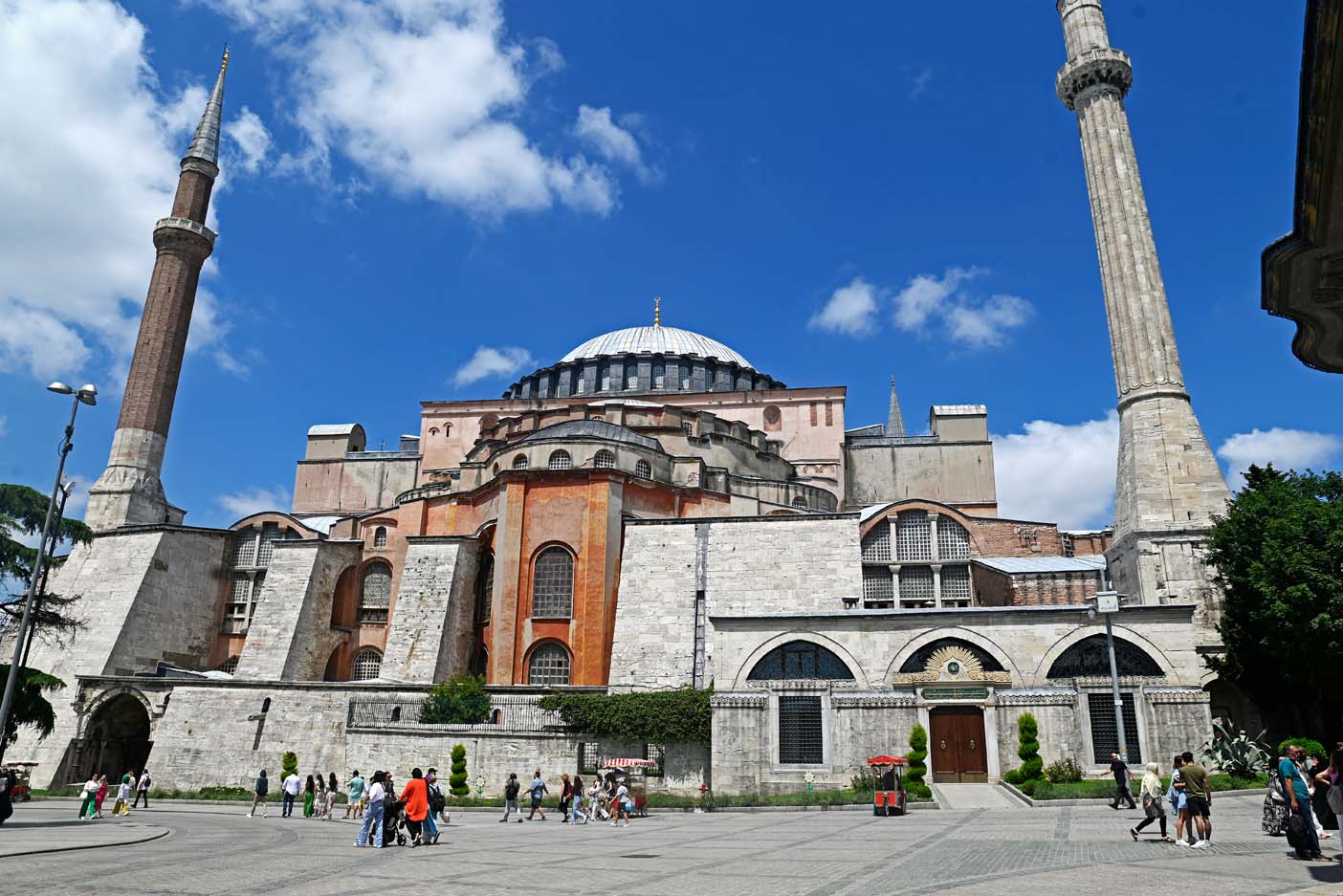 Actuó como tal (mezquita) desde 1453 hasta 1931, cuando el reformista Kemal Atatürk la cerró para abrirla como museo, pocos años después, en 1935. En fecha reciente, 2020, volvió a decidirse, tras orden del actual presidente Erdogan, que funcionara como mezquita. De su arquitectura, llama la atención su espectacular cúpula central, de más de treinta metros de diámetro y a una altura de 56 metros, así como sus mosaicos bizantinos, precisamente tapados desde hace cerca de tres años por ajustarse a la prohibición de exhibir imágenes en este tipo de espacios religiosos.