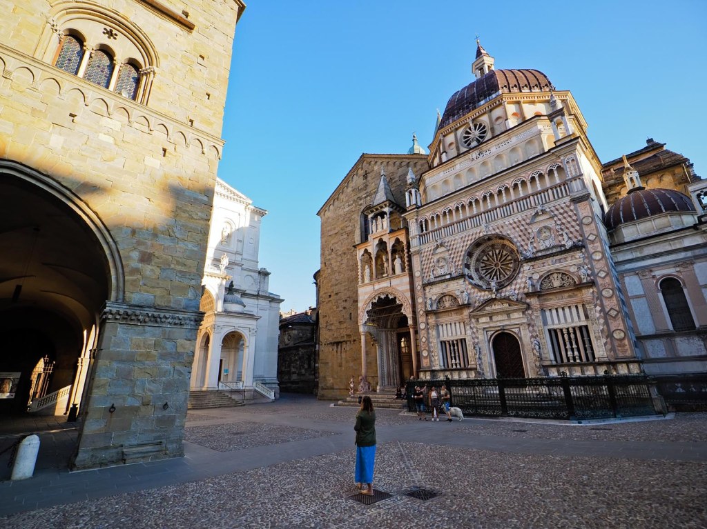 Alcanzando la otra plaza, el edificio, conjunto -podría considerarse- conformado principalmente por la Basílica de Santa María la Maggiore, junto con la Sacristía, Campanario y Capilla Coleoni es destacadísimo. Por fuera ya llaman la atención, pero por dentro la renovación aplicada y experimentada por el edificio principal entre los siglos XVI y XVII, llena de detalles y tapices lombardos y venecianos colgando de sus paredes y la profusión, casi desmedida, de color por todas partes impacta y casi apabulla. Supone un verdadero espectáculo, inesperado. El duomo, por supuesto, también cercano, con fachada y cúpula del siglo XIX, merece su espacio si bien parte del protagonismo se lo lleva la basílica. Desde la Capilla, desde lo alto a donde se puede subir, ofrece unas bonitas vistas sobre la parte Alta y antigua de Bérgamo.
