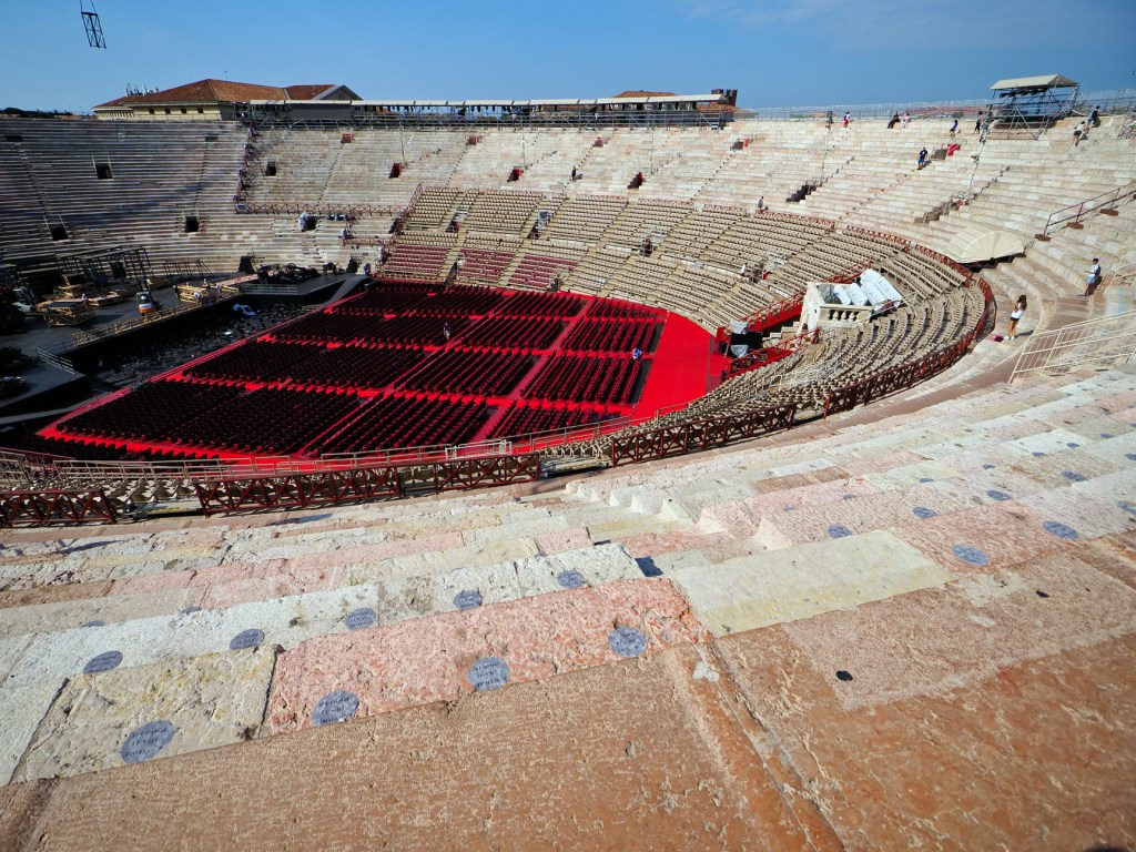 Es uno de esos lugares que sí o sí hay que visitar en Verona, como también otro de los grandes espacios de esta milenaria ciudad, de más de 2.000 años de historia, una de las puertas de acceso desde el norte a Italia, como es la Arena de Verona. Anfiteatro romano, data del siglo I, se encuentra en buen estado de conservación y albergó, entre otros, espectáculos de gladiadores, con capacidad para 30.000 asistentes. Durante nuestra visita, lo vestían de gala para un concierto de ópera de alto copete y que, según lo visto, seguro sería impresionante. El anfiteatro se encuentra en la Plaza de Brá, una de las más grandes de Europa, según leemos, y que forma parte del circuito de plazas, puentes, acueductos y callejuelas que no pueden perderse.