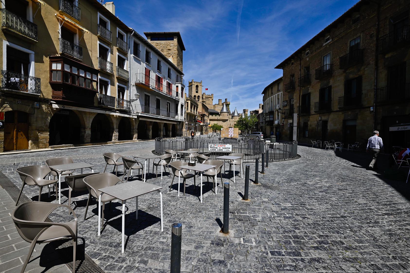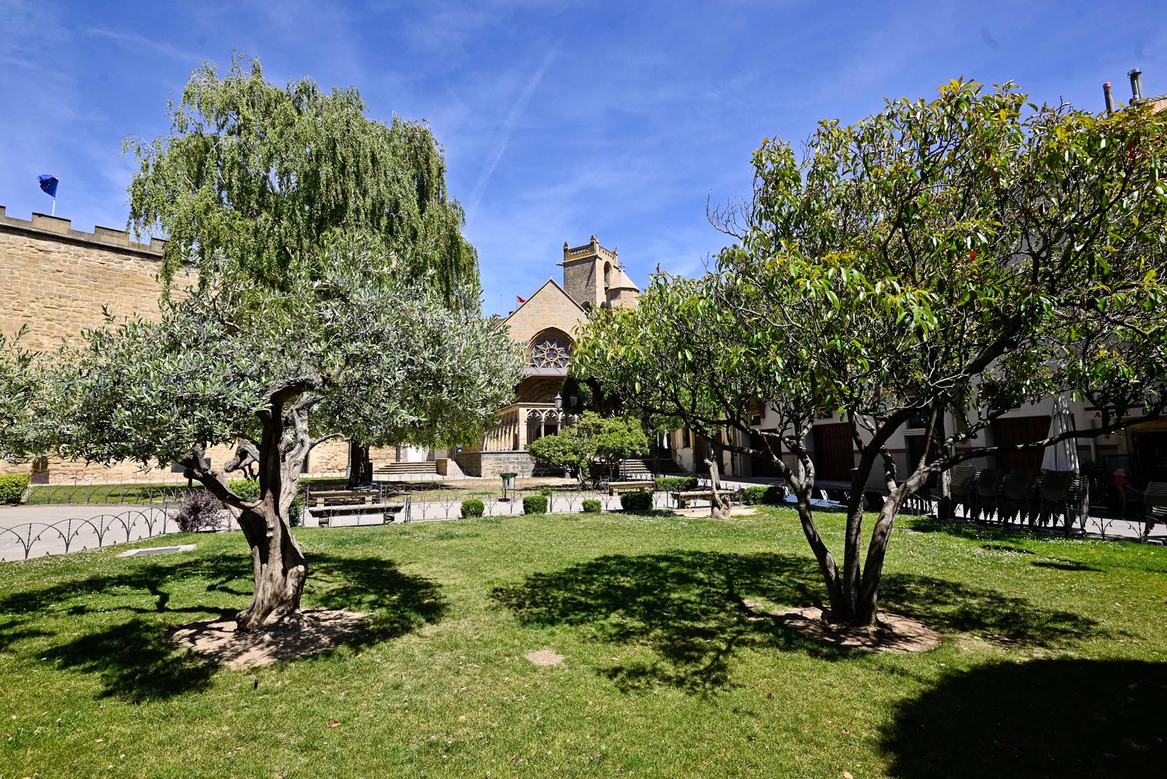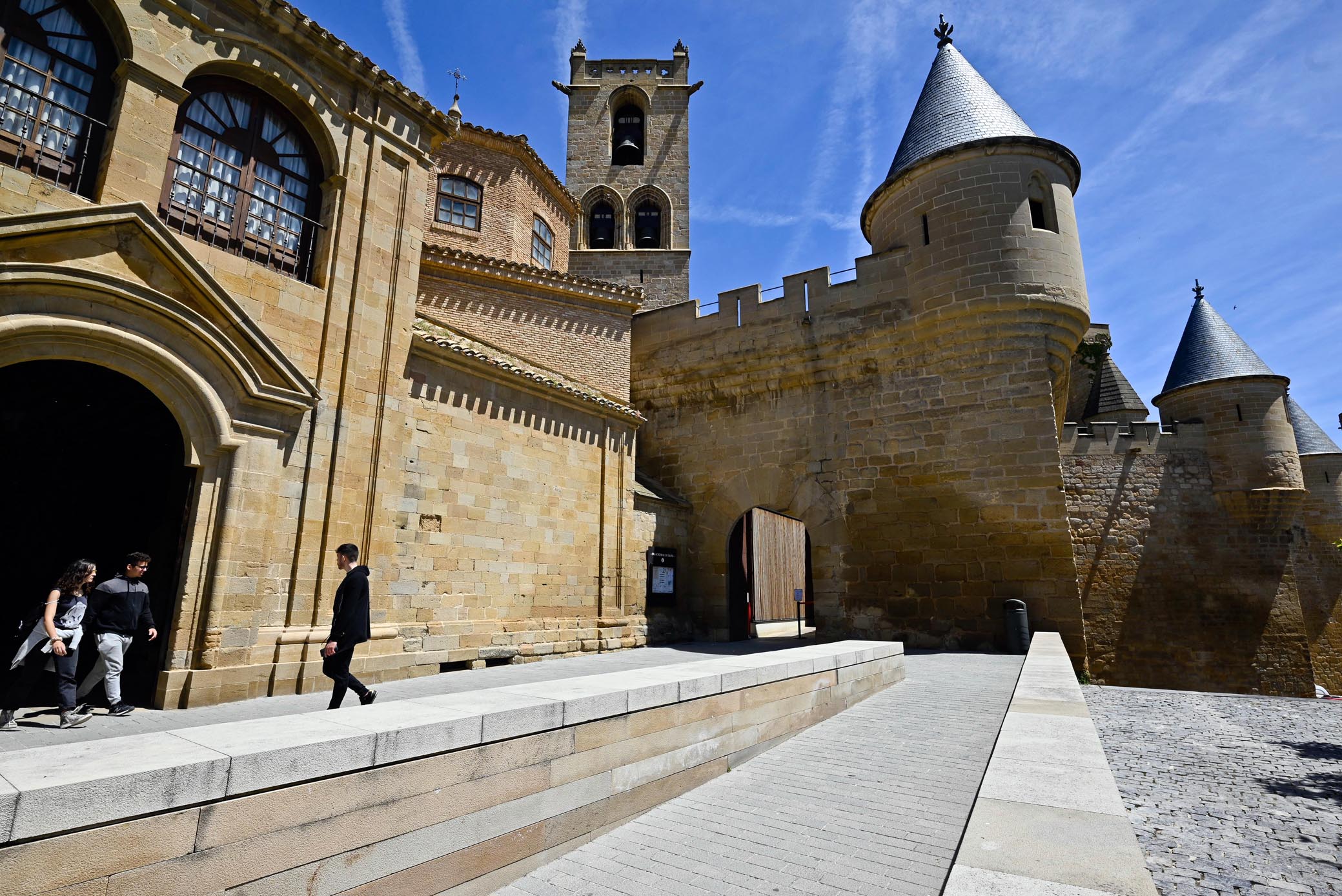 Es una barbaridad, espectacular, imponente, majestuoso, ecléctico. Adjetivos que en el caso del Palacio Real de Olite no se quedan cortos para nada sino que responden a una construcción de larga historia y que, eso sí, en su parte visitable, la Nueva (la Vieja es parte de un parador nacional) es consecuencia de la laboriosa renovación acometida en 1937. Olite, con su centro histórico medieval de calles empedradas, casas nobles de blasones evoacodores, plazas e iglesias y unos cerca de 3.000 habitantes, zona de viñedos y de vino, se define sobre todo – aunque, obviamente, no exclusivamente pero sí en buen medida- por su sorprendente castillo, de visita absolutamente imprescindible.