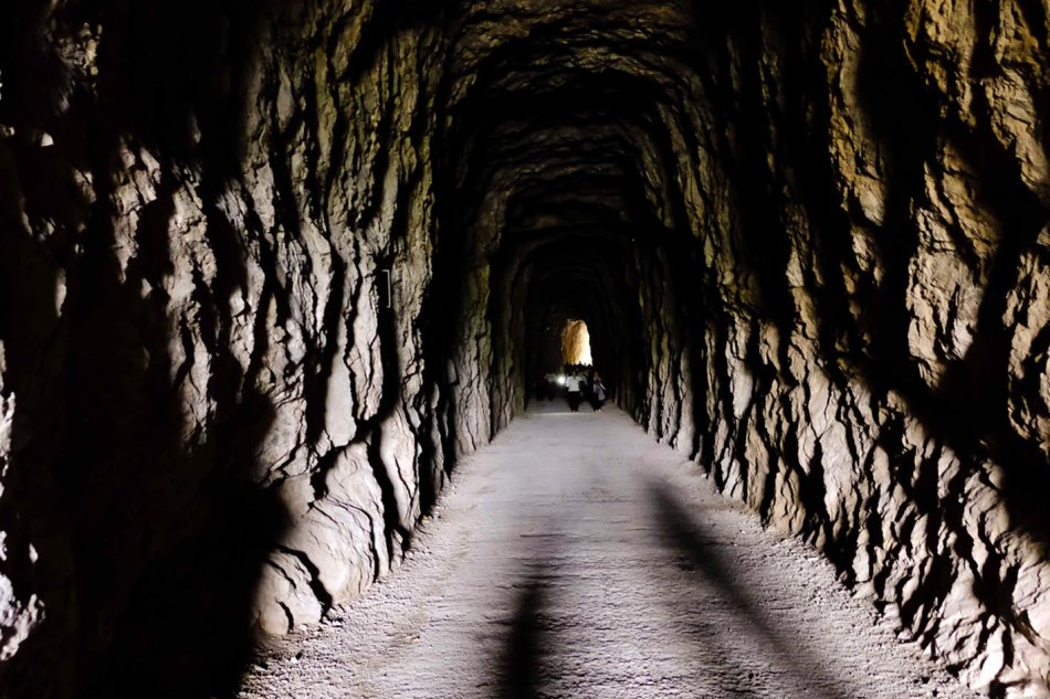 Seguimos, en cualquier caso, con los dos elementos que hacen de este paseo una vivencia singular, como son sus dos túneles: sin iluminación artificial y que hacen de la linterna un elemento casi imprescindible. Metidos de lleno en sus entrañas, la oscuridad llega un momento que es total y que puede que genere cierta incertidumbre. Con acceso por los dos costados, es fácil y habitual oír voces antes de saber desde donde proceden o a qué distancia se encuentran. No es peligroso, si bien no hay que olvidar que también pueden circular bicicletas. El móvil, en cualquier caso, resuelve cualquier duda y la papeleta, minimizando riesgos a su expresión más básica. Explorar las sensaciones producidas por la falta de luz y visión es, en cualquier caso, algo que puede ser interesante vivir por unos instantes.