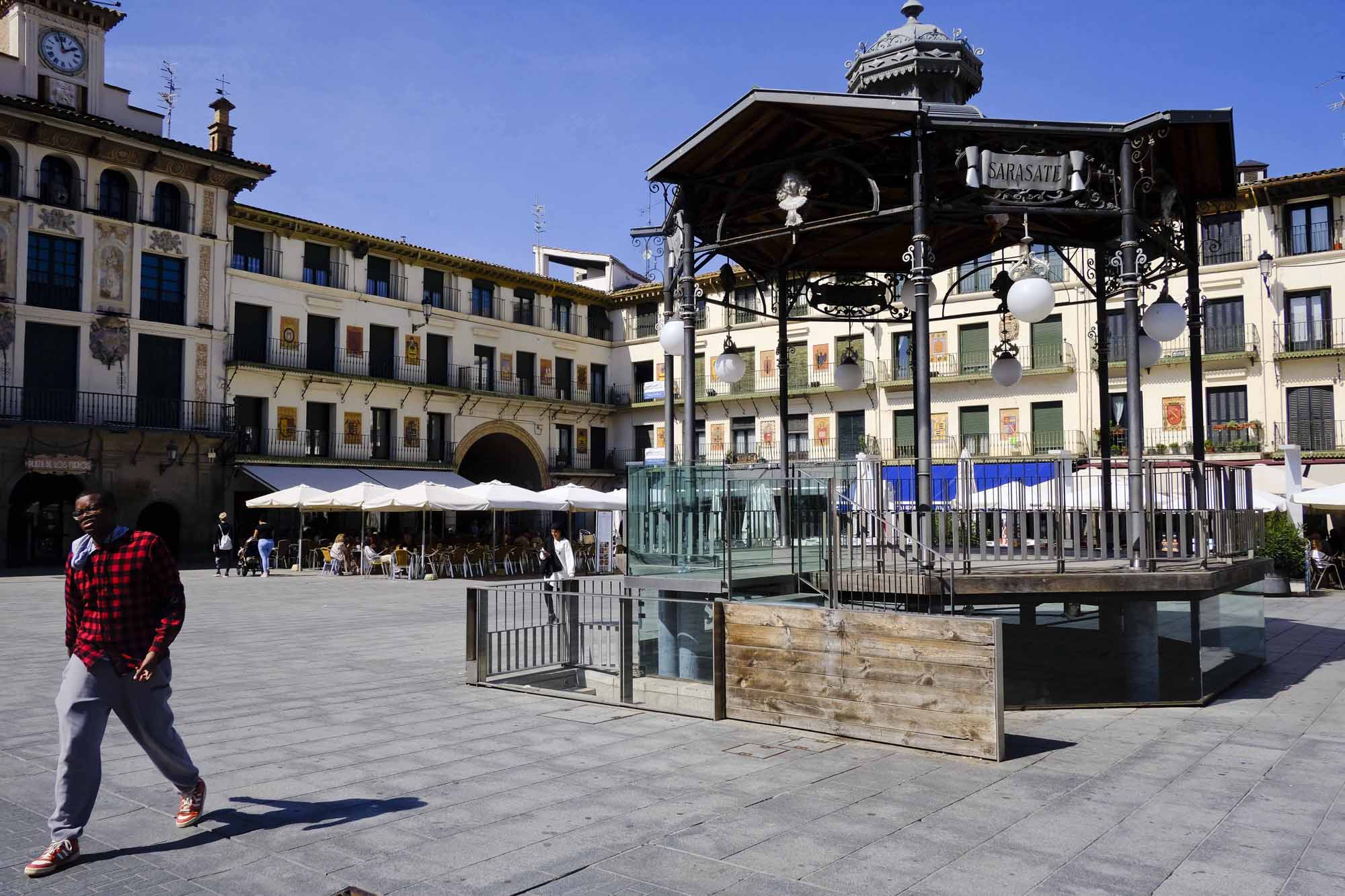 - Plaza de los Fueros: Comparable a la Plaza del Castillo de Pamplona, cuenta con un ‘kiosco’ central (no confundir con el quiosco comercial de venta de periódicos, revistas y/o souvenirs), que fue en el pasado coso taurino y que destaca también por las fachadas de los edificios a sus cuatro costados. De aspecto más o menos señorial, elegantes, de colores crema, suaves o pálidos, según leemos, presentan en sus fachadas los escudos de los principales pueblos de toda esta zona del sur de Navarra, la Ribera. En una de sus esquinas y para los amantes de los selfies y que es ya práctica habitual, cuenta con las letras características sobre el suelo en referencia a su nombre, Tudela, y que invitan a la pose y a la instantánea de rigor.