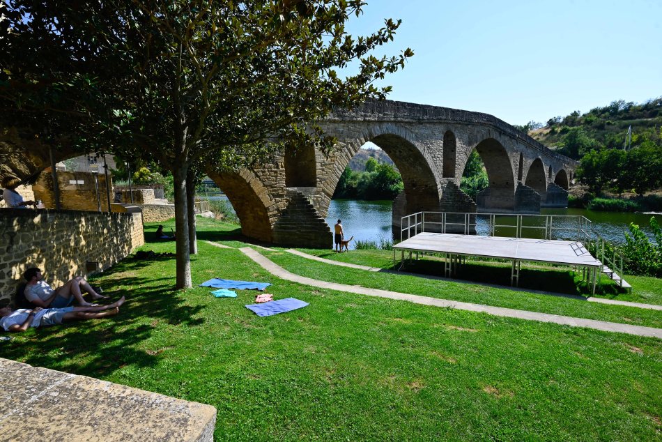 Sí, hay un puente que es el que da nombre al pueblo y parece haberse construido mucho tiempo atrás, en el siglo XI, sobre las aguas del río Arga y, según leemos, «para facilitar el paso de los peregrinos procedentes de toda Europa». Detrás de su construcción podría haberse encontrarse ciertamente una reina pero no está claro quién exactamente. Así, en el panel informativo que se encuentra justo al lado se usa el adverbio «seguramente» para referirse a las dos posibles candidatas: por un lado, «doña Mayor, esposa del rey Sancho el Mayor»; y por el otro, «doña Estefanía, esposa del rey García el de Nájera».