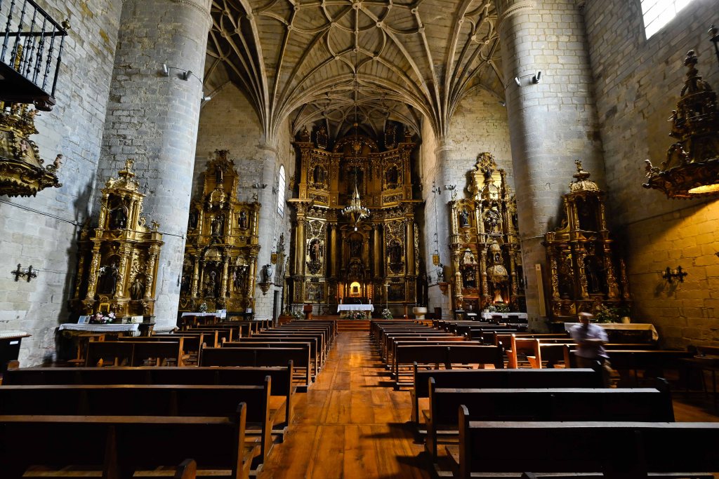 Otro de los grandes puntales de esta villa es la Iglesia de Santiago, en la calle Mayor y que inicialmente era un templo románico del siglo XII, que cuatro siglos más tarde, en el XV, con el crecimiento económico y demográfico de Puente la Reina, se amplió, derribando partes del antiguo templo pero adquiriendo unas dimensiones que se han llegado a calificar de «catedralicias». Hay que decir que desde dentro la estampa es francamente imponente y espectacular y que sorprende ya que desde fuera puede que no dé esa impresión. En el siglo XVIII volvería a experimentar nuevas remodelaciones que la llevarían, más o menos, hasta su aspecto actual. (ver fotos en nuestro IG: @ev_revista)