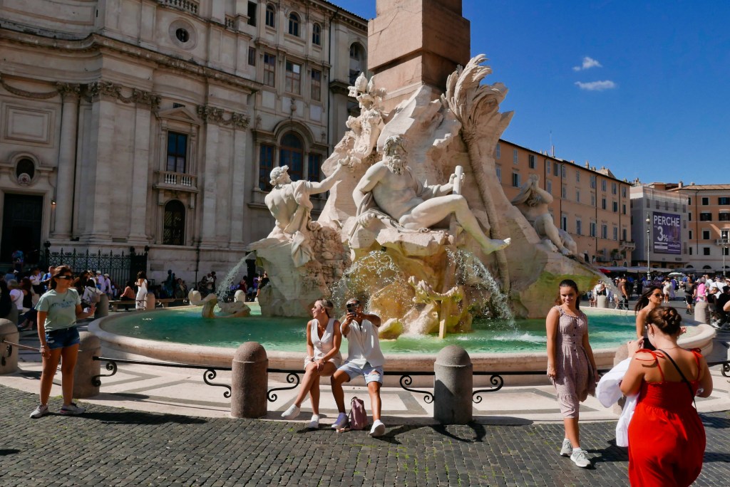 Data de 1651 y es nuevamente creación de Bernini, que dicen las malas lenguas que tenía una relación compleja tirando hacia negativa con su colega Borromini. De ahí que una de sus figuras parezca alzar uno de sus brazos hacia la iglesia de Santa Inés (muy próxima a la fuente y obra de Borromini) y que para Bernini inexorablemente tendría que acabar por derrumbarse. La fuente, en cualquier caso, se llama de «Los Cuatro Ríos» y es francamente de gran belleza y unas dimensiones más que notables. También transmite poderío. Toda la plaza es un lugar agradable para pasaer, sentarse, tomar algo en alguna de sus terrazas… Hay gente pero no se concentra tanta como en otros puntos.
