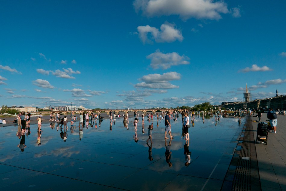 Pero si hay un gran espacio, fotografiable y muy visitado, reciente, de comienzos del siglo XXI, es el «Espejo de Agua», en la Plaza de la Bolsa, al lado del río Garona, -donde se encuentran los edificios de la Bolsa y antiguas aduanas, muestra de la arquitectura francesa del siglo XVIII-, que sirviéndose de un pequeño manto de agua genera unos reflejos espectaculares y francamente bellos. En francés se conoce como Miroir d’Eau y actúa también en verano como espacio para refrescarse y de diversión, especialmente entre los más pequeños que se lo pasan en grande -incluido algún que otro resbalón. Al atardecer, con la caída del sol, es uno de los mejores momentos para acercarse y disfrutar de unas estampas que se califican como «de postal». Y no se equivocan.