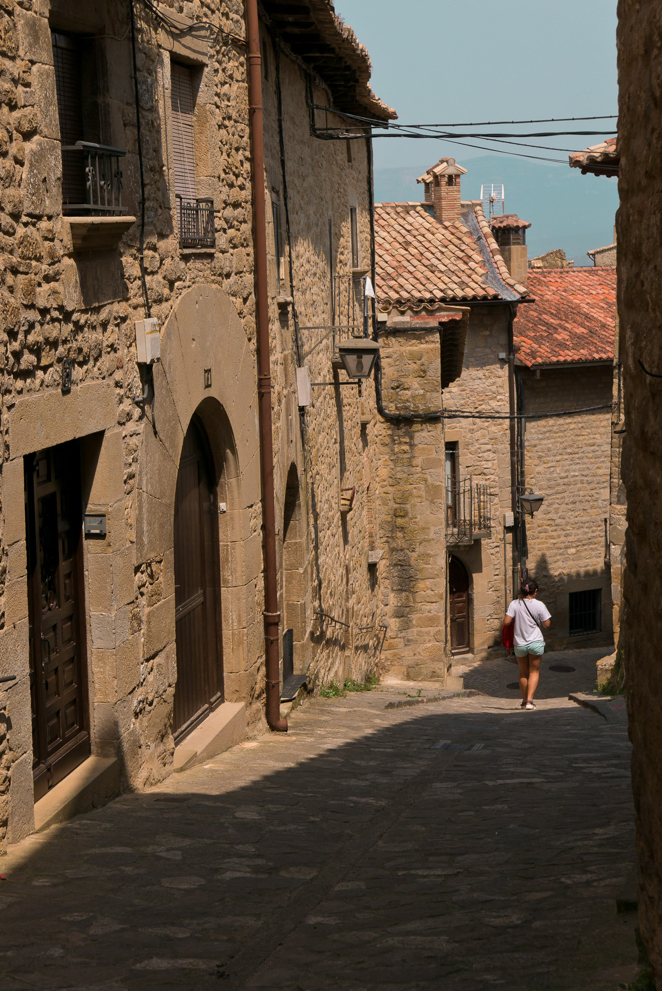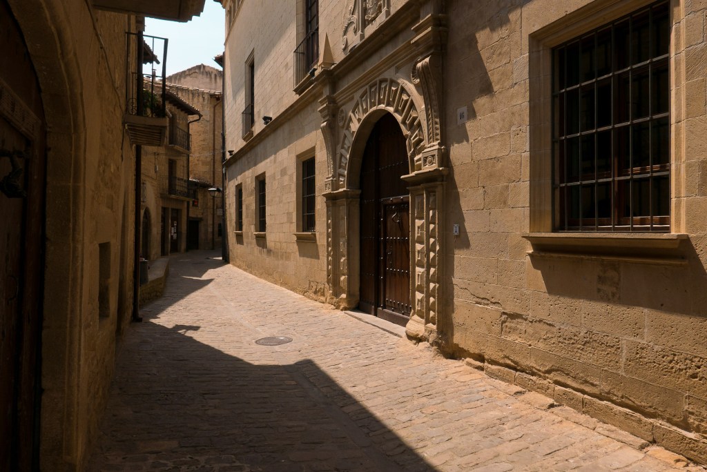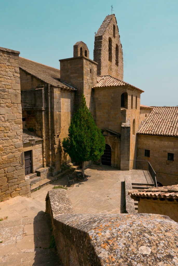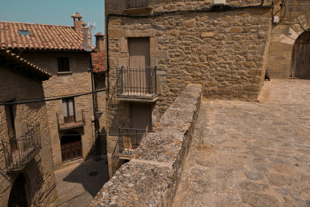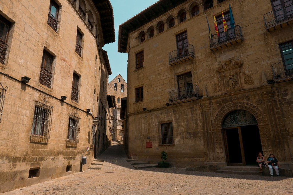 La muralla, con sus miradores, explica en buena medida su valor, con amplias panorámicas sobre toda esta zona del noroeste de Aragón, que cuenta con accesos imponentes como el Portal de Zaragoza. Se aparca fuera y se entra a pie, con buenas indicaciones que permiten orientarse por la antigua judería, casco histórico y llegar sin pérdida -o prácticamente, el pueblo es pequeño y se puede visitar cómodamente en una mañana o tarde- a la plaza del Ayuntamiento. Ésta, porticada, es el centro neurálgico y un lugar ideal y habitual de los vecinos para comer o tomar algo. Hay un par de restaurantes o bares en la zona. Además, cerca se encuentra otro de los lugares de mayor interés de la villa: la iglesia de San Esteban, del siglo XI, románica, y que destaca también por su cripta.